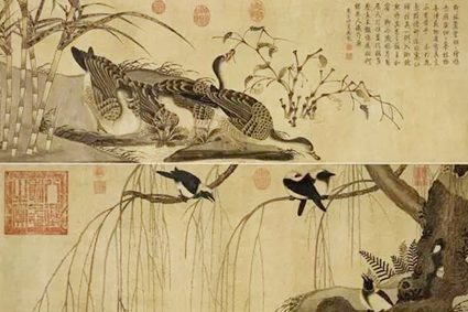赵佶的绘画尤其是花鸟画作品上,经常有御制诗题、款识、签押、印章。