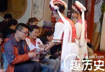 白族三道茶,白族称它为“绍道兆”。这是一种宾主抒发感情,祝愿美好,并富于戏剧色彩的饮茶方式。喝三道茶,当初只是白族用来作为求学、学艺、经商、婚嫁时,长辈对晚辈的一种祝愿。应用范围已日益扩大,成了白族人民喜庆迎宾时的饮茶习俗。