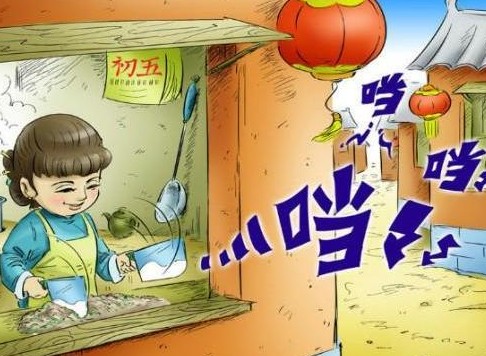正月初五俗称破五,要“赶五穷”,包括“智穷、学穷、文穷、命穷、交穷”。人们黎明即起,放鞭炮,打扫卫生。鞭炮从里往外放,边放边往门外走。说是将一切不吉利的东西都轰将出去。这天,民间通行的食俗是吃饺子,俗称“捏小人嘴” 。