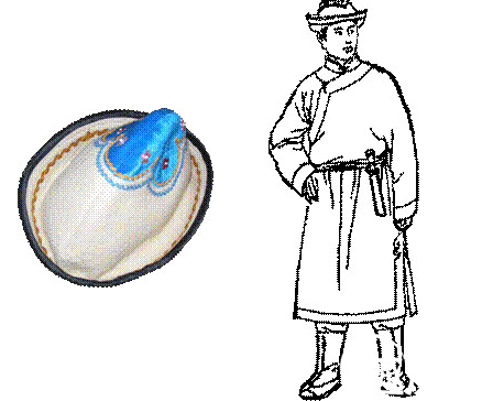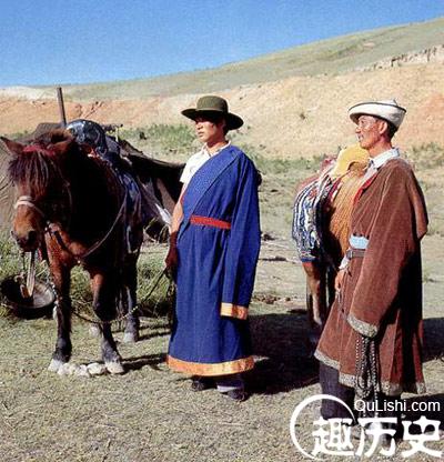 男子一般穿高领左大襟长袍,系紫红色或蓝色腰带,戴圆筒平顶锦缎镶边的白毡帽,穿高筒皮靴。