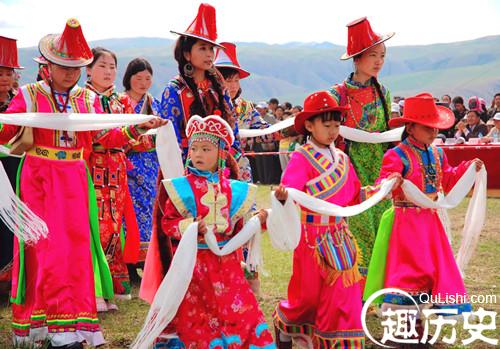 裕固族姑娘的服饰又是另一种风格。姑娘三岁剃头时,要把后脑勺的一片头发留下来,长发和串有珊瑚珠的丝线编成一条辫子,辫梢垂线穗被塞到背后的腰带里。两鬓的头发按年岁的增长,一岁编一个小辫,一直到出嫁。到了十三四岁时,前额要带“沙日达升戈”,即在一长条红布上,用各色珊瑚珠,缀成美丽的图案,做成一条三寸宽的长带,带的下沿用红色或红、白两色小珠子串成很多穗子,把带子从前额缠过系到脑后,穗子像珠帘一样齐眉垂在姑娘的前额。身穿类似大人的小袍褂,腰束彩色腰带,胸前戴“舜尕尔”,背后带“曲外代尕”,即用红布做成的两块长方形硬布牌,上缀有鱼骨做的圆块、各色珊瑚珠组成的图案,下边有红色线穗,并用各色珊瑚、玛瑙、玉石珠串成的珠链把两块布牌连起来,戴在脖子上,分别垂挂在胸前和背后。