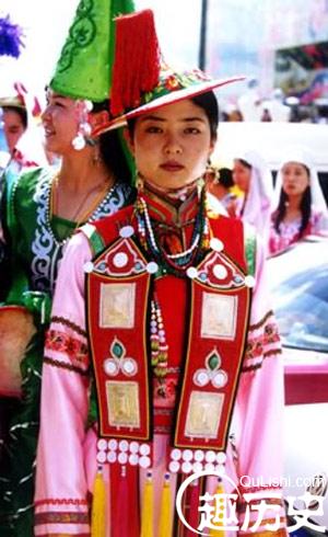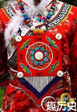 据裕固族传说,智勇双全的裕固族可敦(公主)萨尔玛珂,在民族面临危亡的关头,亲自带领众骑兵冲锋陷阵,突袭打败了围攻的敌人,最后血洒沙场,人们称颂她为拯救民族的英雄。妇女的服饰中胸前两片“罕”,表示遮住乳房和两腿,后垂的“董地斯”,表示遮住脊骨,飘荡在帽顶上的红缨穗和红色腰带,表示洒满草原的鲜血,以纪念这位英雄。裕固族妇女在胸前或在腰带上佩有5 种圆形、方形、三角形绣花荷包,分别 盛放针线、香料、钱币、鼻烟等物,腰间系有5色丝巾。