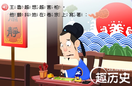 原来,老百姓在状子中所列举的种种犯罪事实,全都和王鲁自己曾经干过的坏事相类似,而且其中还有许多坏事都和自己有牵连。状子虽是告主簿几个人的,但王鲁觉得就跟告自己一样。他越想越感到事态严重,越想越觉得害怕,如果老百姓再继续控告下去,马上就会控告到自己头上了,这样一来,朝廷知道了实情,查清了自己在当涂县的胡作非为,自己岂不是要大祸临头!
