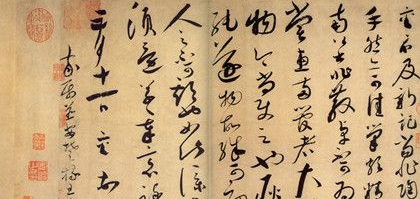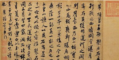 他重在写“意”,寄情于“信手”所书之点画。苏轼的字看似平实、朴素,但有一股汪洋浩荡的气息,就像他渊厚的学问一样,神龙变化不可测。他长于行书、楷书,笔法肉丰骨劲,跌宕自然,给人以“大海风涛之气”、“古槎怪石之形”的艺术美感。苏轼的书法,后人赞誉颇高。黄庭坚他在《山谷集》里说:“其书姿媚……至酒酣放浪,意忘工拙,字特瘦劲……
