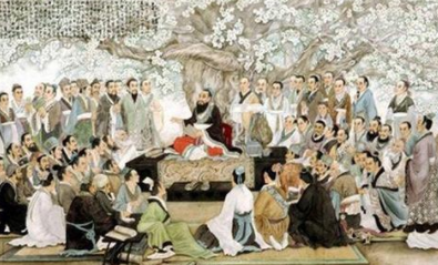 有一天,孔了领着学生在河边游玩,碰见一位见解很深刻的渔翁,于是孔子虔诚地向他求教,他说:我从读书起至今已经六十九岁了,还没有听到高深的教诲,今天碰到您这样的圣人,怎敢不虚心求教呢?渔翁被孔子的诚心所感动,就讲了一大套有关政治哲学及人生修养等方面的道理,孔子深感佩服,要求渔翁收自己为徒。渔翁拒绝了孔子的请求,他走后,几个学生请孔子上车,孔子呆呆地望着渐渐远去的船,一动不动。一个学生实在不平,忍不住说道:先生今天真是太过分了,连那些拥有万乘战车的天子、千乘战车的诸侯,您都和他们平起平坐,可是却对一个渔你这样毕恭毕敬。