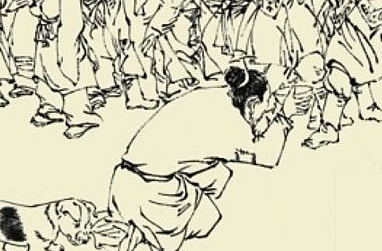 西汉·司马迁《史记·范睢蔡泽列传》:“膝行蒲伏,稽首肉袒,鼓腹吹篪,乞食于吴市。”