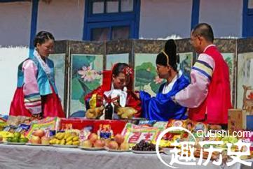 婚俗,是朝鲜族家庭礼仪最重要的组成部分。过去,婚俗复杂,礼仪繁多,首先,男方家要让媒人到女方家看女方情况如何,这叫“看善”,与汉族的“相亲”差不多。如满意,小伙正式向姑娘求婚。女方家如果也愿意,男方家就往女方送“四柱”。四柱,就是在一张纸上写着姓名和星辰宿象(出生年、月、日、时)。女方家接到小伙的“四柱”后,再拿姑娘的“四柱”对“穹合”。所谓“穹合”,是指男女双方的属相是否相顺而不相克。这不是简单地看合得来合不来,而是要认认真真地看二人的生肖能不能完全对上。如二人生肖不合,婚事就没有希望了。