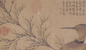 在图右处,有一只戴胜正栖于枝头,它回首看着左方,长长的嘴,目光锐利的看着前方,头上冠以翎毛,看上去精神抖擞。在它的脖颈处有一圈黑白相间的羽斑,戴胜的双翅与尾翎都很长而且色彩斑驳。画家用笔工整细致,将戴胜的形神表现得生动逼真。