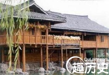 吊脚楼:在地势斜度大或一侧临水、沟的地方,为适应地势扩大居住面积,往往把房舍的一侧临空扩展,让其吊在主室之后或一侧,并在其下安上一根以上的支柱。