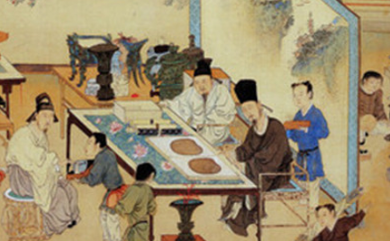 张丑《清河书画舫》:仇英画“山石师王维,林木师李成,人物师吴元瑜,设色师赵伯驹,资诸家之长而浑合之,种种臻妙”。