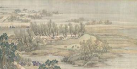 王翚此图,写江南景色。起首平林清旷,坡陀相续,浅沙远水,天遥日暮。坡岸之间,蹊径蜿蜒,山势渐起,村舍列列映带于乔木茂树之间。小道之上,人骑往来,碧溪尽头,归鸦翔集。