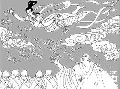 南朝时期佛教盛行,梁武帝非常信仰佛教,他在全国各地到处建设寺庙,烧香拜佛,请印度僧人波罗末到中国来宣讲佛法,有几次他还亲自到寺庙中舍身同泰寺。云光法师是梁武帝的好朋友,听云光法师讲诵佛经是梁武帝生活中一件重要的事情。有一次云光法师讲诵《涅槃经》时,云光法师讲得绘声绘色,从早上一直听到晚上,梁武帝也听得非常认真。云光法师讲得感动了上天,天上的香花从空中纷纷落下,梁武帝看着飞舞的鲜花,感叹地说:想不到佛法竟然如此奇妙!梁武帝从此更加的沉迷于佛教。