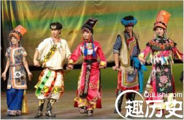 “情歌”也是表达双方爱慕之情的另种形式的舞蹈。舞蹈的队形十分特殊,参加舞蹈的第一对男女情人并肩而立,其余舞者先作为这对情人的亲朋好友,男女按“八”字形分站两旁相对而立。两个相互靠拢的情人,各拿一条手帕作为在舞蹈中传情达意的道具。他们的服饰古朴、典雅,女青年着湖蓝色长衫,头帕上的有精美手绣花纹,绣花“云云”踏出的舞步,牵动着羊皮背心下摆长长的羊皮穗子来回甩动,衬托出年轻山民们俊美和青春的活力。