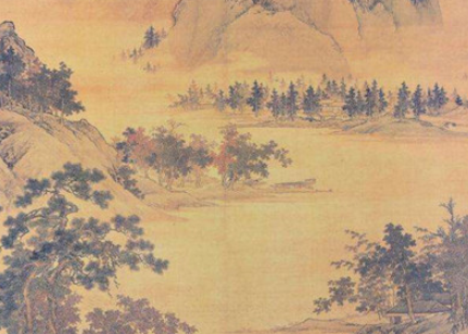白云下的房舍屋宁、树林画得虽细小,但十分精工,所以把白云上面的山推向远处。近景为此画的核心,近岸山峦很高,村庄座落其间,显得十分细小,但画得十分精致。画面上的树林杂木众多,通过画家的笔触,画得各有特色,成为整幅画上的重要组成部分。
