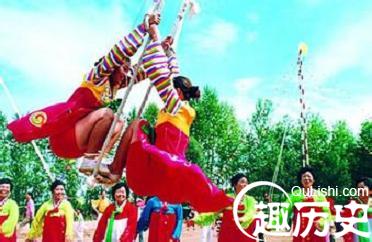 荡秋千:也叫“打秋千”,是朝鲜族传统体育项目,尤其受到妇女们的喜爱,并经常进行该项目的比赛。比赛时评定优胜者有几种方法:一种是以秋千架前方高树上的树叶或花朵为目标,用脚碰着或咬掉树叶(花朵)者为胜;一种是在踏板底下挂一根长绳,测量秋千荡起的高度,高者为胜;还有一种是在秋千架前方竖两根树杆,杆上横拉一根系有铃铛的绳子,荡秋千者以碰铃次数多少决定胜负。