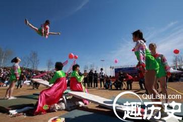 跳板:朝鲜族的传统体育项目。流行于吉林、黑龙江、辽宁朝鲜族聚居区。多在元宵、端午和中秋节举行。参加者多为女子,比赛进行时以2~4人为一组,分别站在一块长约5米的跷跷板两端,它有“抽线”和“表演”两种。“抽线”在跷跷板两端各置一团线,抽出线头系于比赛者的脚踝上,在规定的时间内,以比赛者弹跳时所抽出的线的长度、高度,来判定胜负。“表演”则有自选动作和规定动作两种,主要根据比赛者的跳动动作难度和姿势进行评分。